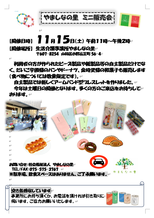 11月15日(土)にミニ販売会を開催します! 今年も、だいご学園様のパンやドーナツ、金時堂様の和菓子、ご寄付頂いた商品等も一緒に販売させていただきます。 皆様のお越しを心よりお待ちしております😄